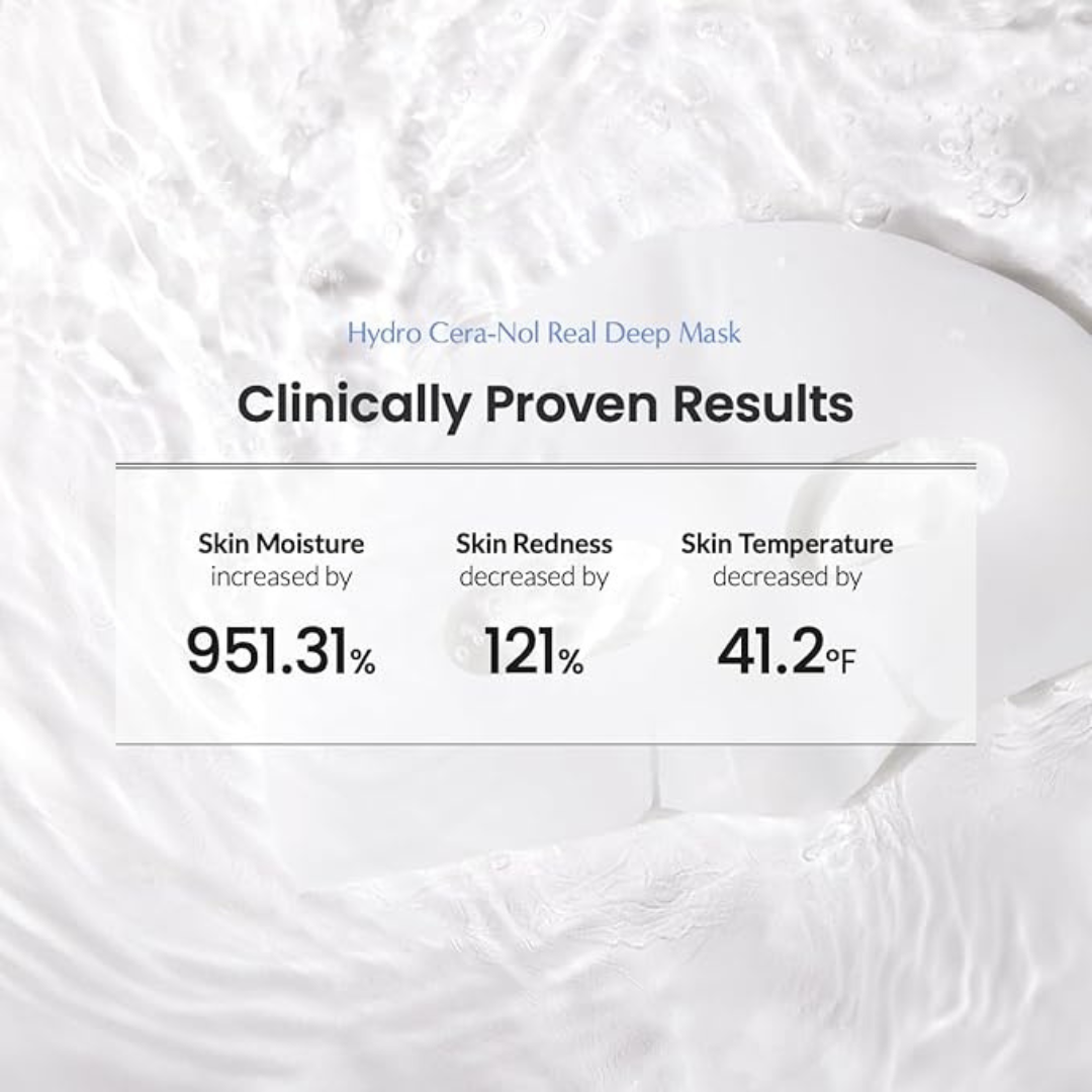 Hydro Cera-Nol Real Deep Mask uses high purity glacial water rich in minerals, to enhance the absorption of active ingredients and form a moisturizing film over the skin. Each mask is infused with 1.19 ounces of ampoule consisting of Hyaluronic Acid, Ceramides, and Panthenol, which then becomes absorbed into your skin to soothe and strengthen the skin barrier. Clinically proven to increase the skin’s moisture levels, calm irritations and redness, and hydrate. Each hydrogel mask contains 1.19 fluid ounces of solidified highly-concentrated serum.