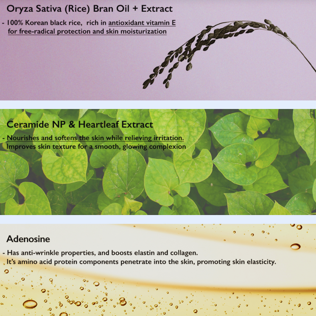 Water, Dibutyl Adipate, Propanediol, Butyloctyl Salicylate, Ethylhexyl Triazone, Terephthalylidene Dicamphor Sulfonic Acid, Glycerin, Niacinamide, Tromethamine, Polyglyceryl-3 Distearate, 1,2-Hexanediol, Pentylene Glycol, Diethylamino Hydroxybenzoyl Hexyl Benzoate, Cetearyl Alcohol, Caprylyl Methicone, Polysilicone-15, Stellaria Media (Chickweed) Extract, Helianthus Annuus (Sunflower) Flower Extract, Vaccinium Vitis-Idaea Fruit Extract, Oryza Sativa (Rice) Extract, Bellis Perennis (Daisy) Flower Extract, Houttuynia Cordata Extract, Oryza Sativa (Rice) Bran Oil, Hydrogenated Lecithin, Polymethylsilsesquioxane, Palmitic Acid, Butylene Glycol, Stearic Acid, Glyceryl Stearate, Bis-Ethylhexyloxyphenol Methoxyphenyl Triazine, Potassium Cetyl Phosphate, Poly C10-30 Alkyl Acrylate, Methylpropanediol, Carbomer, Ammonium Acryloyldimethyltaurate/VP Copolymer, Acrylates/C10-30 Alkyl Acrylate Crosspolymer, Glyceryl Stearate Citrate, Ethylhexylglycerin, Adenosine, Polyether-1, Myristic Acid, Biosaccharide Gum-1, Tocopherol, Moringa Oleifera Seed Oil, Ceramide NP, Phytosphingosine, Phenethyl Alcohol, Sodium Chloride, Disodium Phosphate, Potassium Chloride, Potassium Phosphate