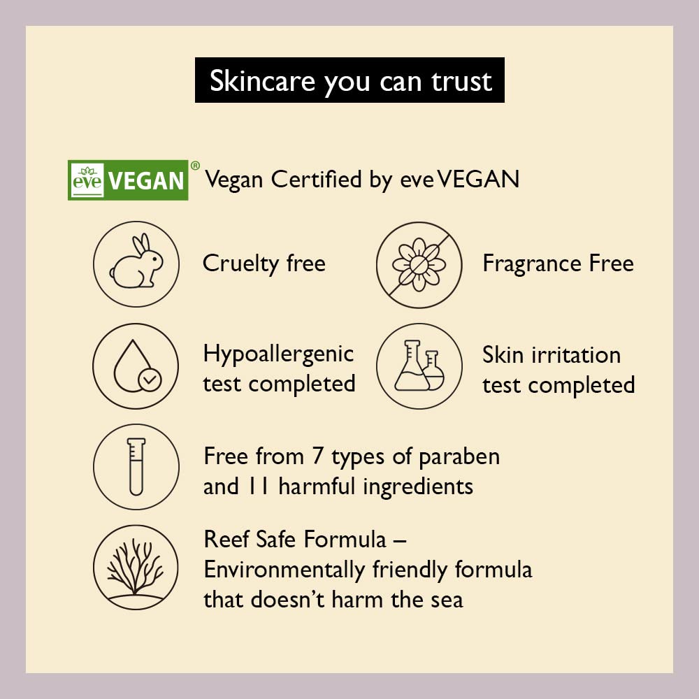 Fitted with broad spectrum SPF50+ PA++++ for powerful UVA and UVB protection, and won’t leave a white cast. Free of toxic ingredients such as phthalates, parabens, sulfates, mineral oil, drying alcohol, synthetic dyes, and fragrance. Reef safe.