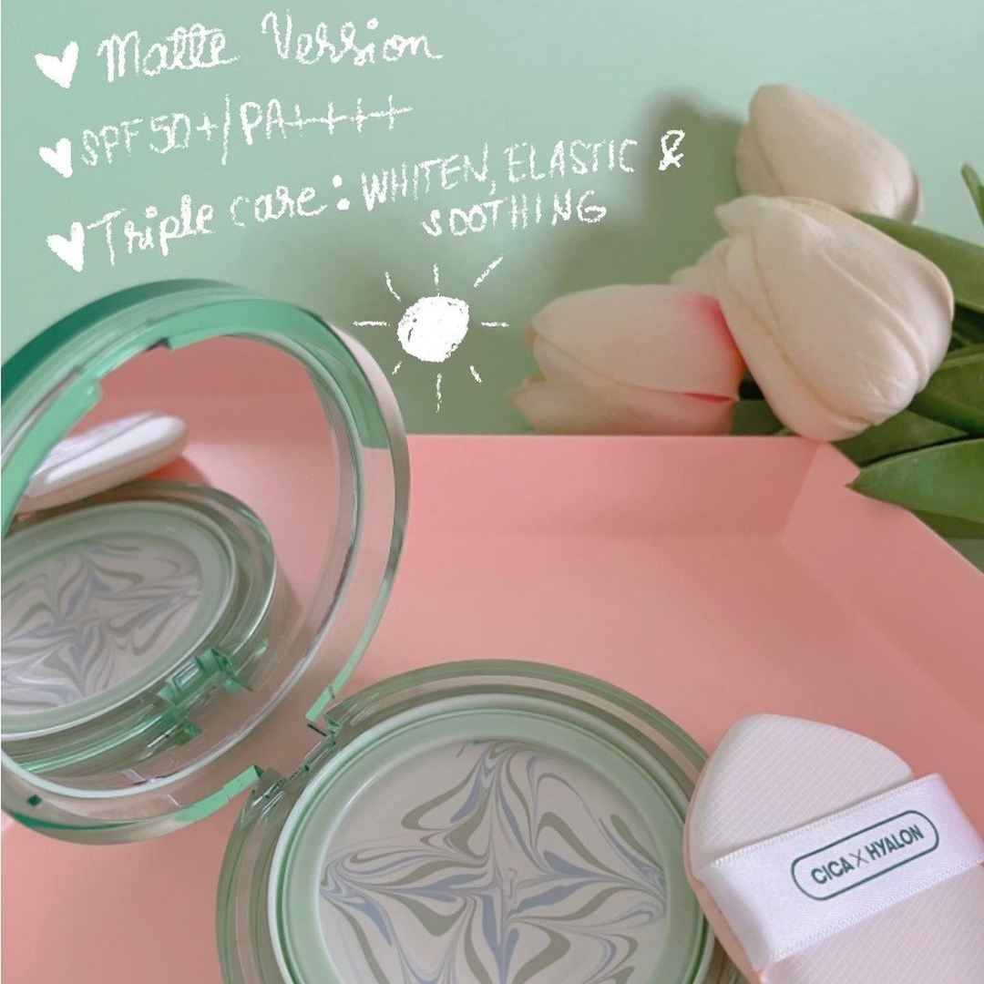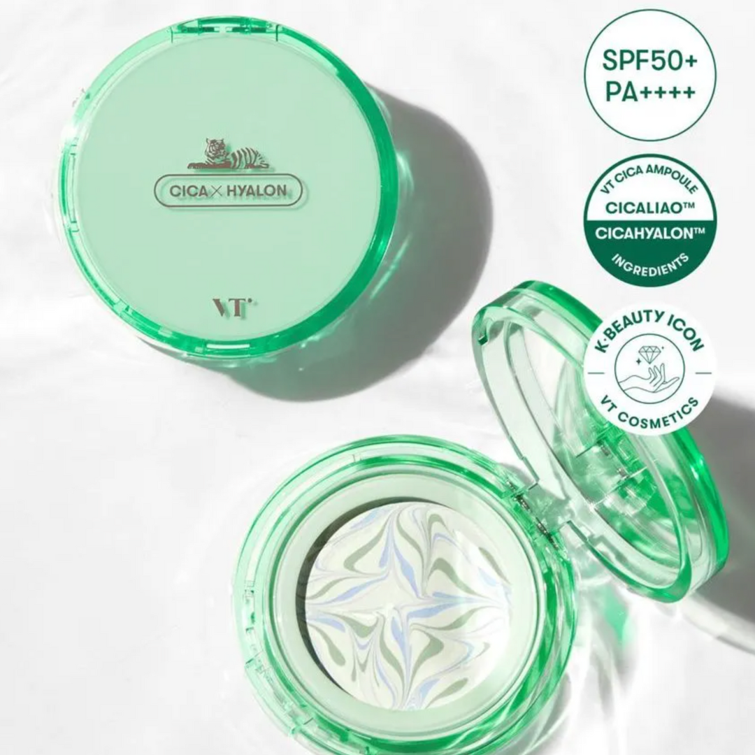 Cica Essence Sun Pact is a lightweight sunscreen that provides SPF50+ PA++++ protection with the added benefit of Centella Asiatica, Hyaluronic Acid, Vitamin C, and Collagen for brightening and hydration. Formulated with VT’s unique Cicahyalon™ to retain moisture and give you a refreshing feeling from Centella Asiatica, Madecassoside, and 3 types of Hyaluronic Acid.