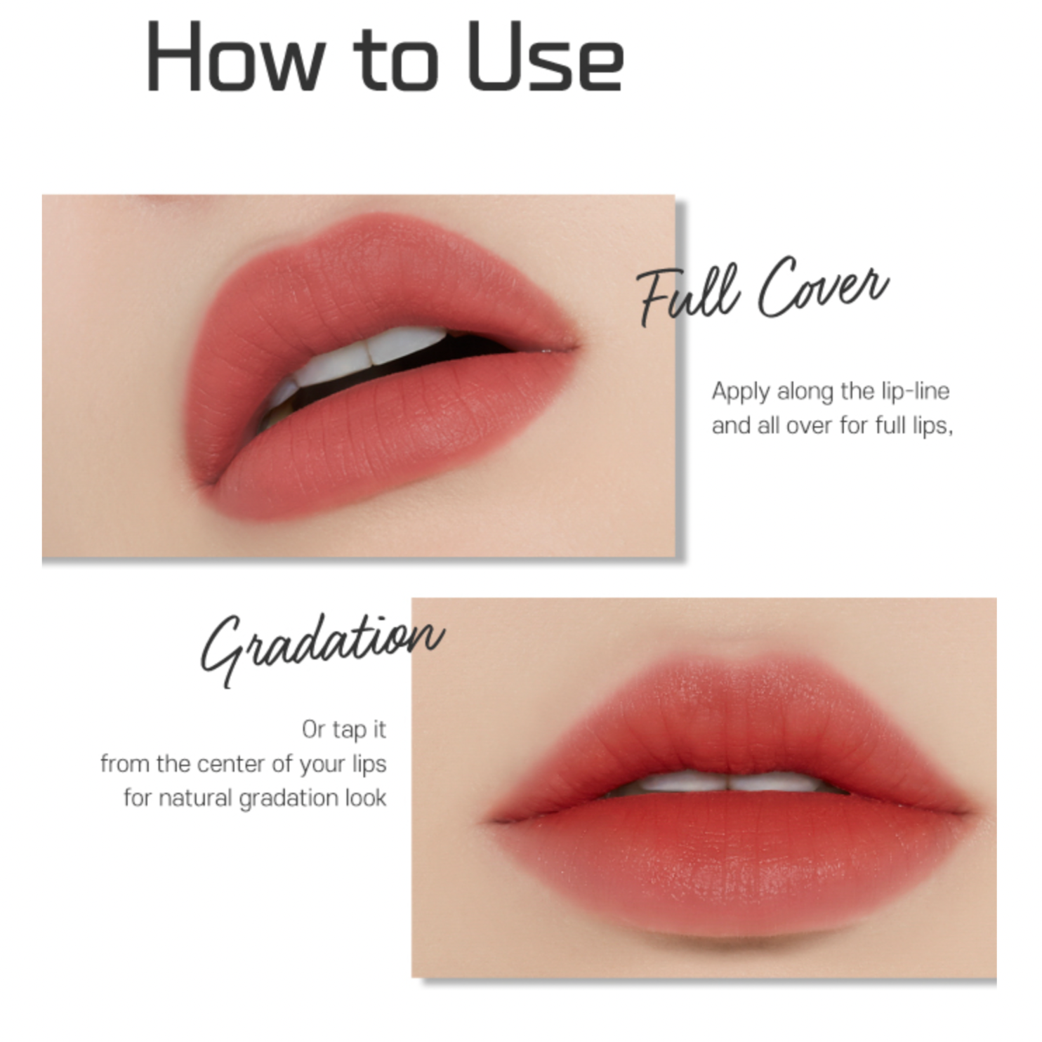 Apply tint along the lip line and fill in for full lips, or apply from the center of your lips and blend outwards for a natural gradation.