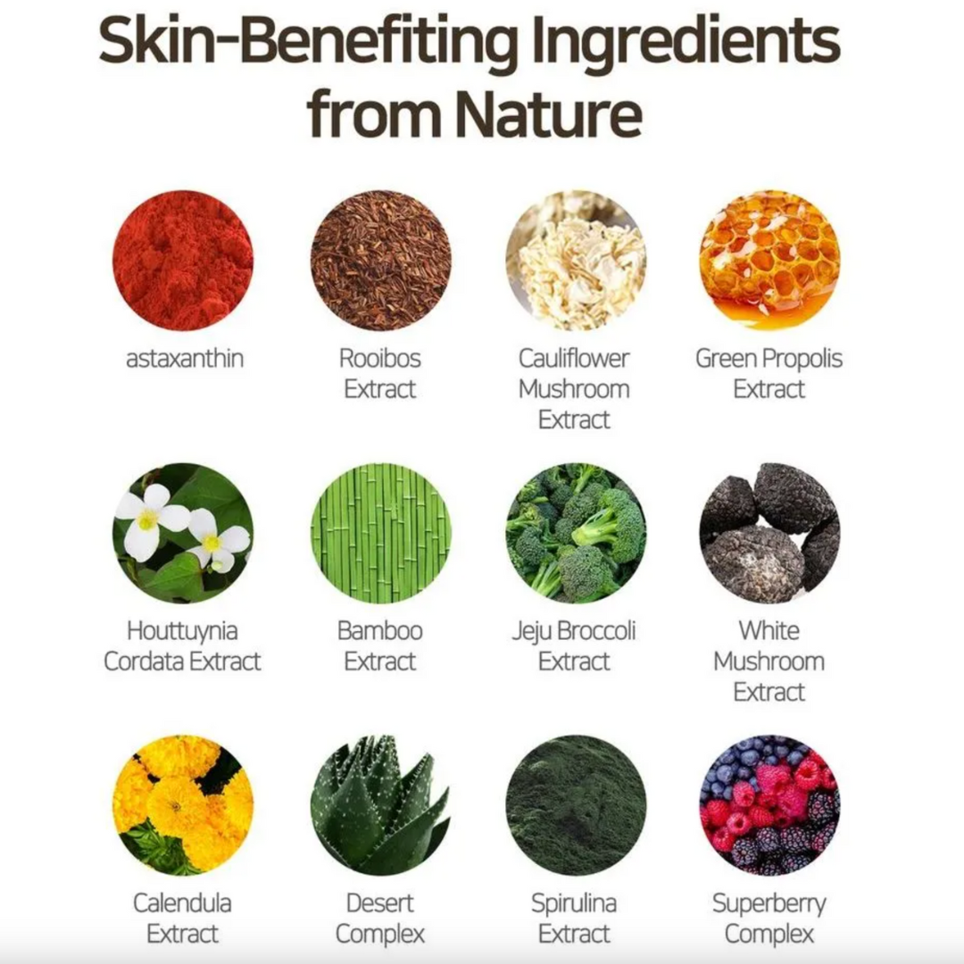 Galactomyces Ferment Filtrate, Butylene Glycol, 1,2-Hexanediol, Niacinamide, Glycerin, Ascorbic Acid, Tromethamine, C12-14 Pareth-12, Water, Allantoin, Cellulose Gum, Ethylhexylglycerin, Adenosine, Hydrogenated Lecithin, Polyglyceryl-10 Stearate, Panthenol, Sodium Ascorbyl Phosphate, Phenylethyl Resorcinol, Propolis Extract, Aronia Arbutifolia Fruit Extract, Aspalathus Linearis Extract, Bambusa Vulgaris Extract, Maltodextrin, Saccharide Hydrolysate, Ficus Carica (Fig) Fruit Extract, Phoenix Dactylifera (Date) Fruit Extract, Tuber Magnatum Extract, Biotin, Folic Acid, Houttuynia Cordata Extract, Pyridoxine, Opuntia Coccinellifera Fruit Extract, Opuntia Ficus-Indica Extract, Caprylic/Capric Triglyceride, Adansonia Digitata Seed Extract, Leuconostoc/Radish Root Ferment Filtrate, Brassica Oleracea Italica (Broccoli) Extract, Calendula Officinalis Flower Extract, Sparassis Crispa Extract, Cyanocobalamin, Tocopherol, Euterpe Oleracea Fruit Extract, Ribes Nigrum (Black Currant) Fruit Extract, Rubus Fruticosus (Blackberry) Fruit Extract, Rubus Idaeus (Raspberry) Fruit Extract, Vaccinium Angustifolium (Blueberry) Fruit Extract, Vaccinium Macrocarpon (Cranberry) Fruit Extract, Vaccinium Myrtillus Fruit Extract, Spirulina Maxima Extract, Astaxanthin, Inositol, Linoleic Acid, Thiamine Hcl, Disodium EDTA, Citrus Aurantium Bergamia (Bergamot) Fruit Oil, Limonene, Lavandula Angustifolia (Lavender) Oil, Linalool, Caramel