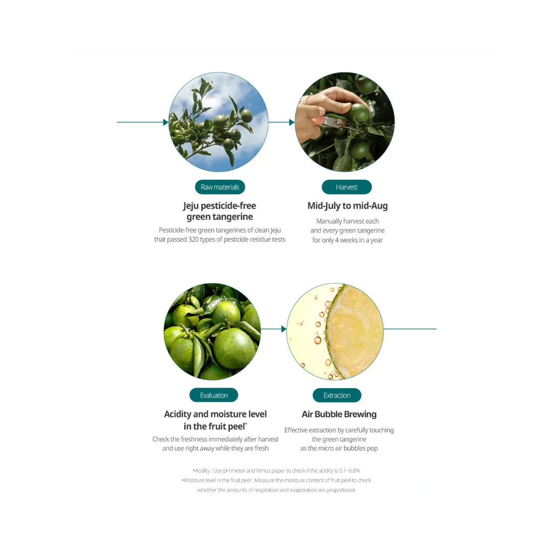 Pesticide-free Green Tangerines are harvested from Jeju Island for only 4 weeks out of the year when they are at their peak freshness and vitality. Stored at ultra-low temperatures, they’re manually harvested and extracted when they are at their freshest stage.